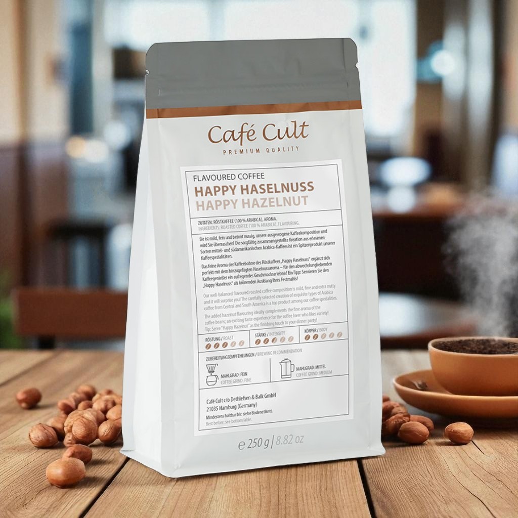 Ce café aromatisé à la noisette séduit par sa douceur et son parfum irrésistible. Élaboré à partir de grains 100 % arabica d’Amérique centrale, il allie une torréfaction artisanale à une touche gourmande parfaitement équilibrée. En tasse, on découvre une texture veloutée, un corps harmonieux et une saveur de noisette délicatement sucrée. Idéal pour les amateurs de cafés doux et parfumés, il accompagne à merveille un dessert, un chocolat ou une pause café plaisir. Le « Happy Hazelnut » offre un vrai moment de gourmandise, à savourer aussi bien en expresso qu’en méthode douce.