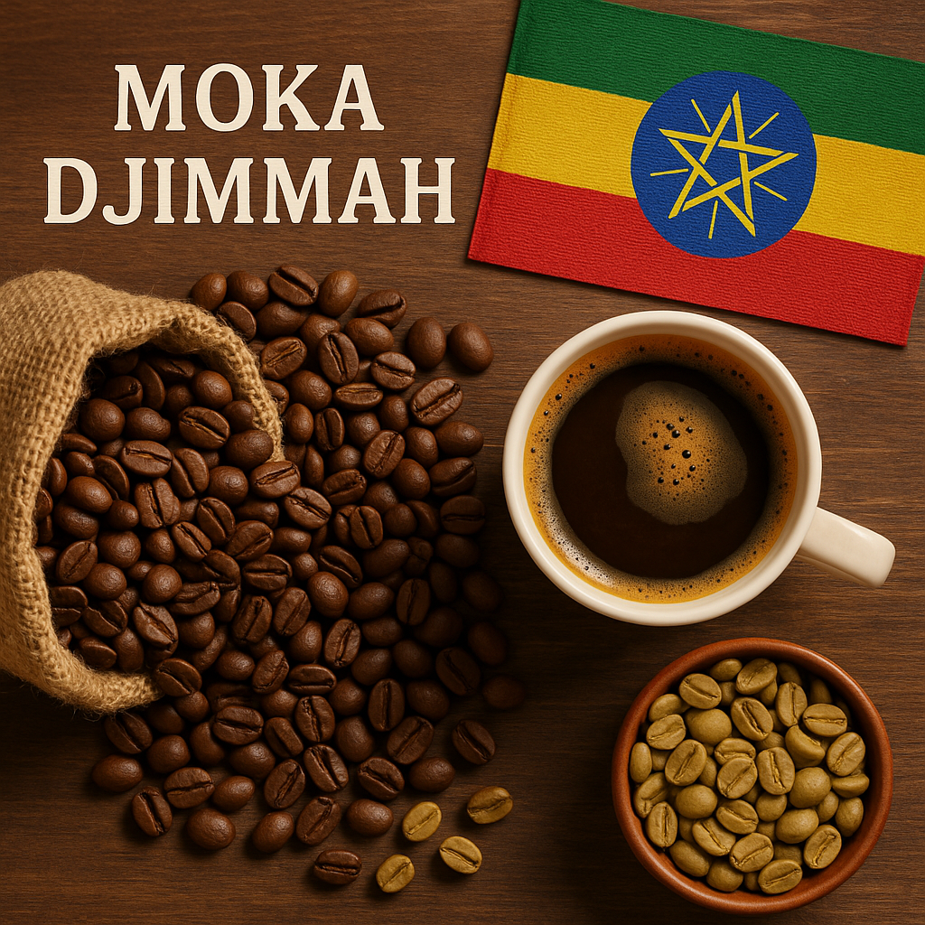 Le Moka Djimmah est un café emblématique d’Éthiopie, pays considéré comme le berceau du café arabica. Cultivé dans la région de Djimmah, à l’ouest du pays, ce café pousse à des altitudes comprises entre 1 400 et 1 800 mètres, dans un environnement naturellement propice à son développement. Récolté selon des méthodes traditionnelles, il est principalement préparé par voie sèche, ce qui lui confère une identité unique.