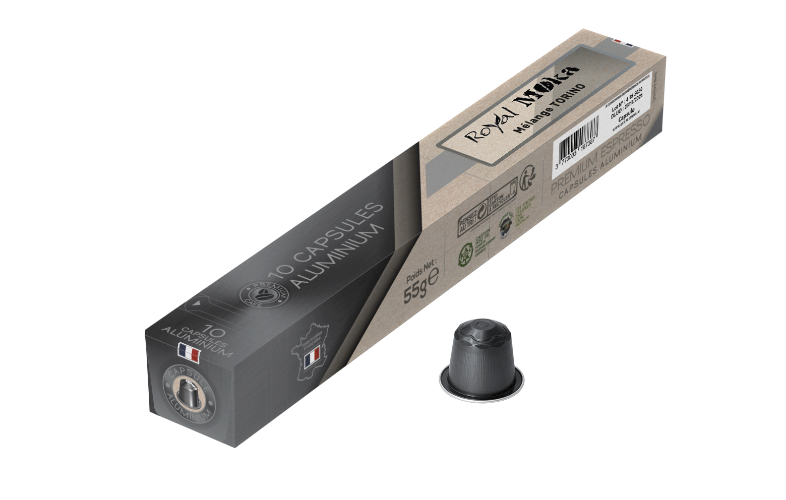 Capsules compatibles Nespresso® Mélange Torino : un café corsé et persistant en bouche, composé de 100% arabica pour une dégustation riche et équilibrée.