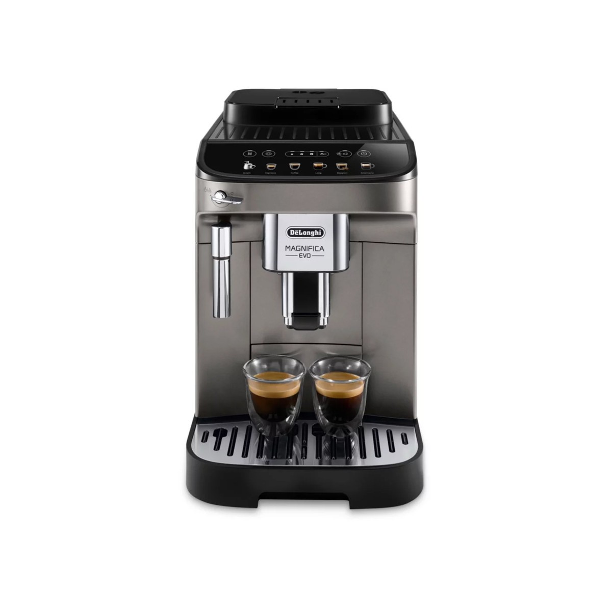 La De’Longhi Magnifica Evo FEB2942.TB est une machine expresso automatique dotée d’un broyeur intégré, permettant de préparer des cafés à partir de grains fraîchement moulus. Elle offre 6 recettes préprogrammées accessibles via un écran tactile intuitif aux icônes colorées, facilitant la sélection de vos boissons préférées. La buse vapeur intégrée permet de réaliser des mousses de lait onctueuses pour des cappuccinos et lattes. Son design compact et élégant en finition titane s’intègre parfaitement dans toutes les cuisines. De plus, elle dispose d’une fonction d’économie d’énergie, garantissant une consommation optimisée.