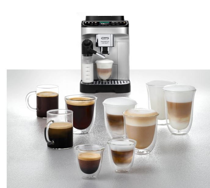 Magnifica Evo Next incarne l’expérience, le savoir-faire et la technologie De’Longhi pour toujours offrir les meilleurs résultats en tasse. Elle satisfait tous les goûts avec un choix de 10 boissons grâce à son interface conviviale dotée d’icônes colorées et d’un écran TFT. Personnalisez vos boissons avec 5 tailles, 4 niveaux d’intensité et 3 options de température, et savourez une mousse fine et riche grâce à la technologie LatteCrema Hot pour toutes vos boissons à base de lait.