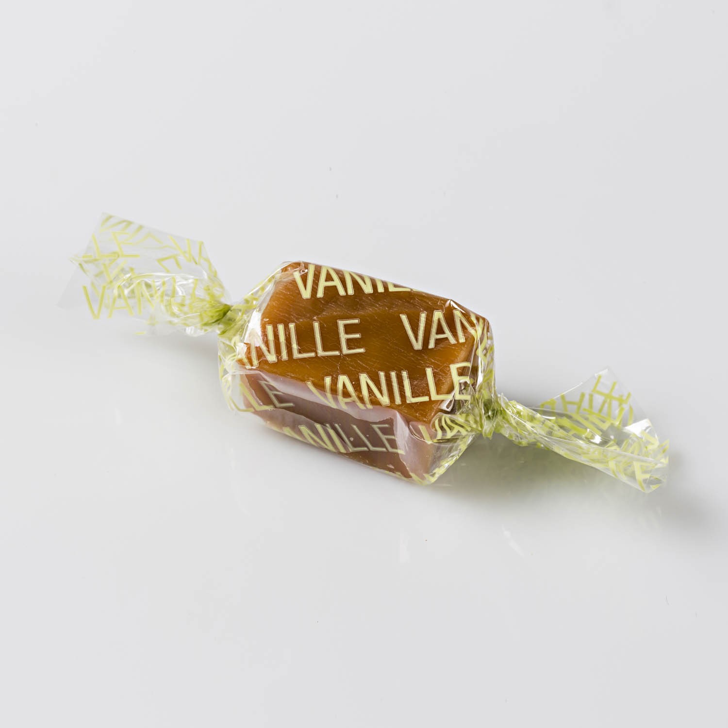 Boite en bois, de caramels au beurre et à la vanille, emballés en papillotes.