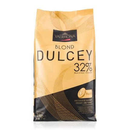 Comment d’un oubli naît une merveille… Lors d’une démonstration pâtissière, Frédéric Bau laissa un peu trop longtemps du chocolat blanc au bain-marie. Quand il s’aperçut de cet oubli, il constata que la couleur avait viré au blond et qu’une délicate odeur de sablé grillé et de lait caramélisé s’en échappait. La mise au point de Dulcey tel qu’on le connaît aujourd’hui aura nécessité 8 années de recherche et développement pour mettre au point une recette unique offrant un nouveau monde de création et de saveurs. Cette couverture s’appuie ainsi sur toute l’expertise Valrhona, pour offrir de nouvelles émotions et une vraie différenciation par sa couleur, son goût et sa texture.