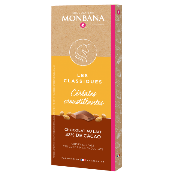 La tablette de chocolat au lait et céréales croustillantes de Monbana est une gourmandise irrésistible qui séduira les amateurs de chocolat fondant et de textures croustillantes.