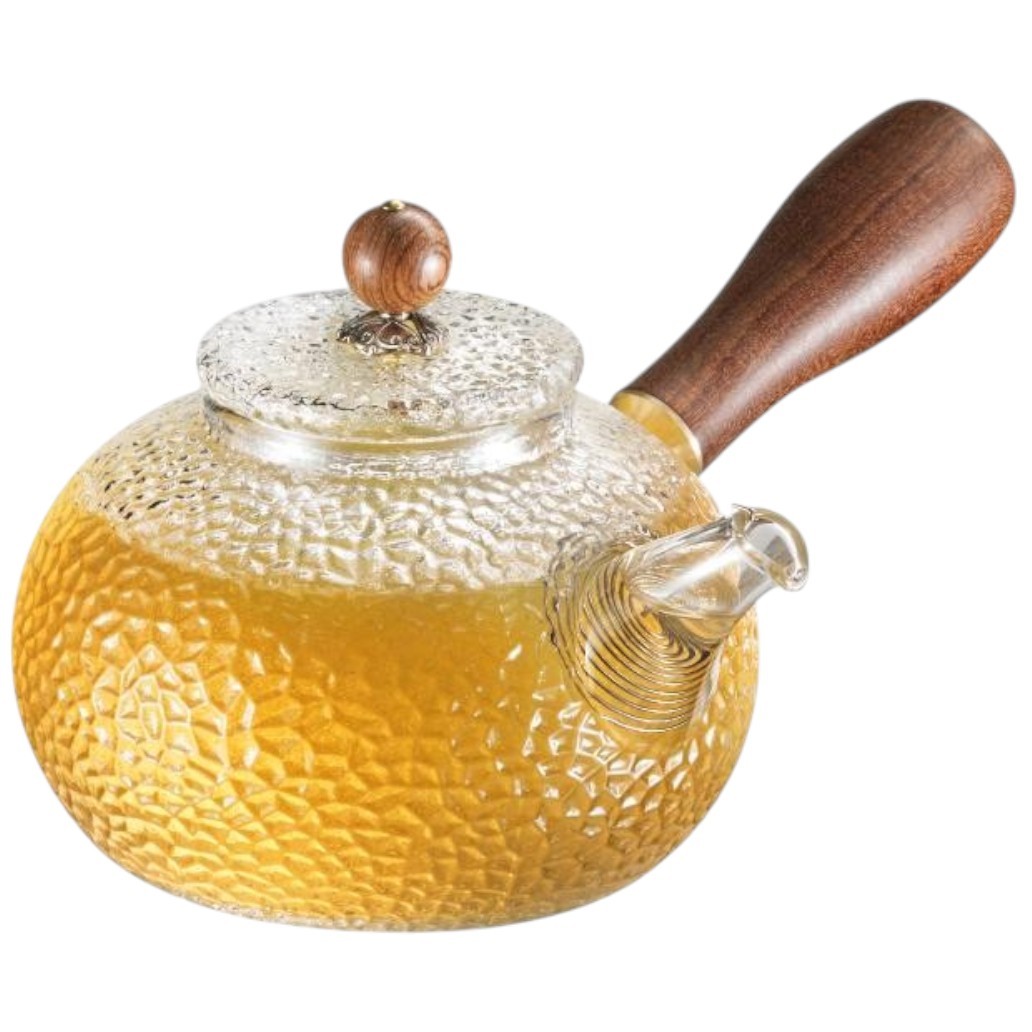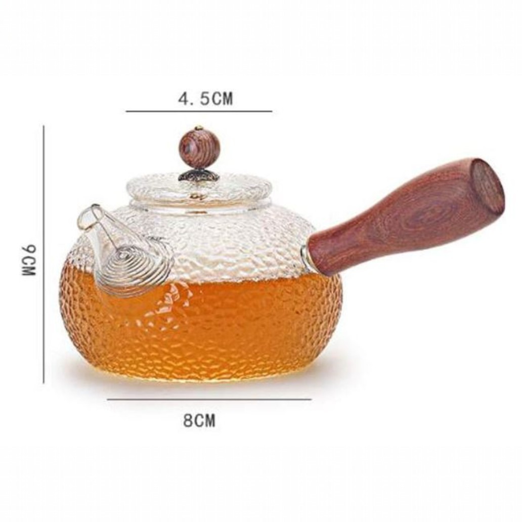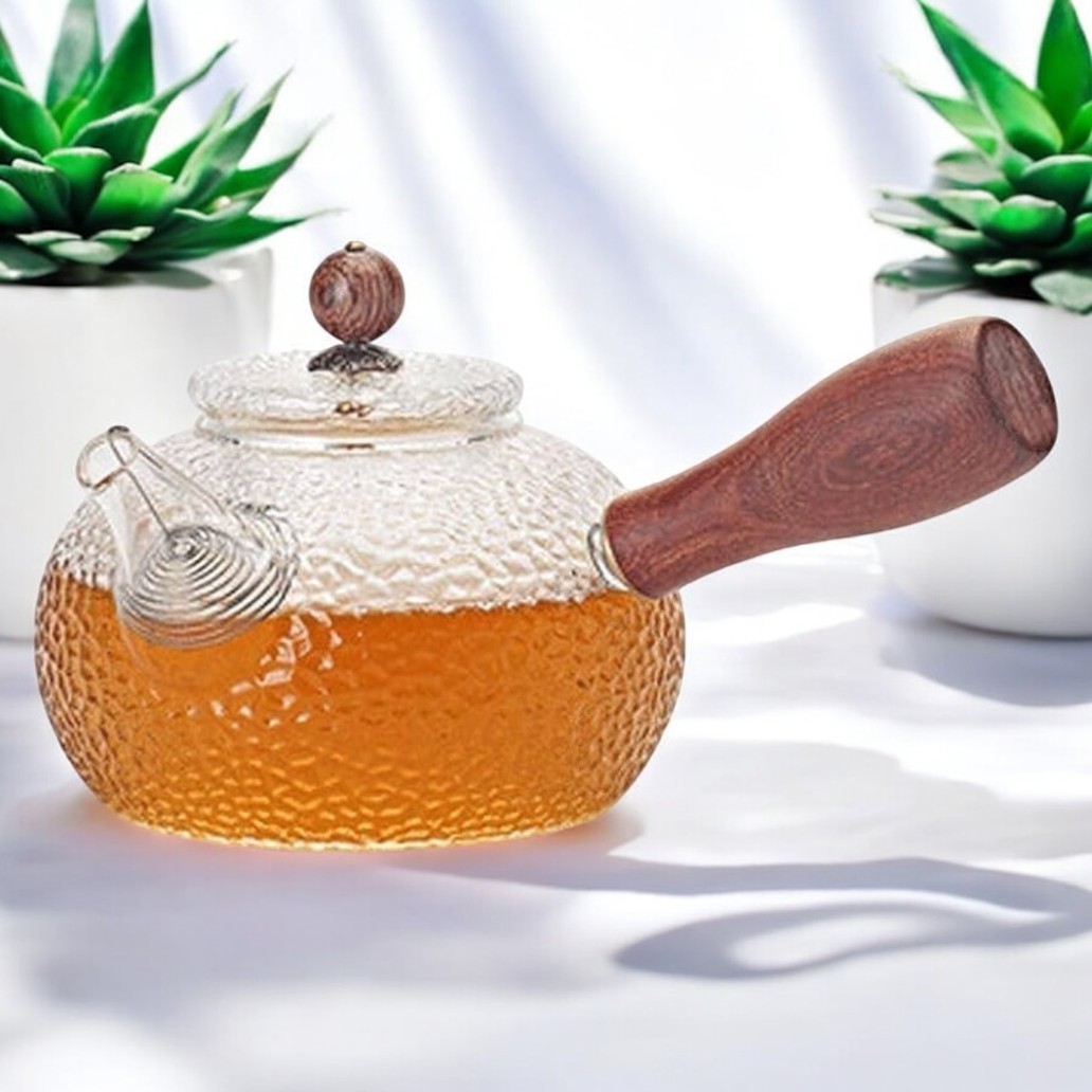 Le verre martelé apporte une touche esthétique unique tout en renforçant la robustesse de la théière. Sa poignée en bois ergonomique permet une prise en main confortable et sécurisée, réduisant les risques de brûlure. Le bouton en bois sur le couvercle complète l’ensemble avec harmonie et facilite l’ouverture sans se brûler.