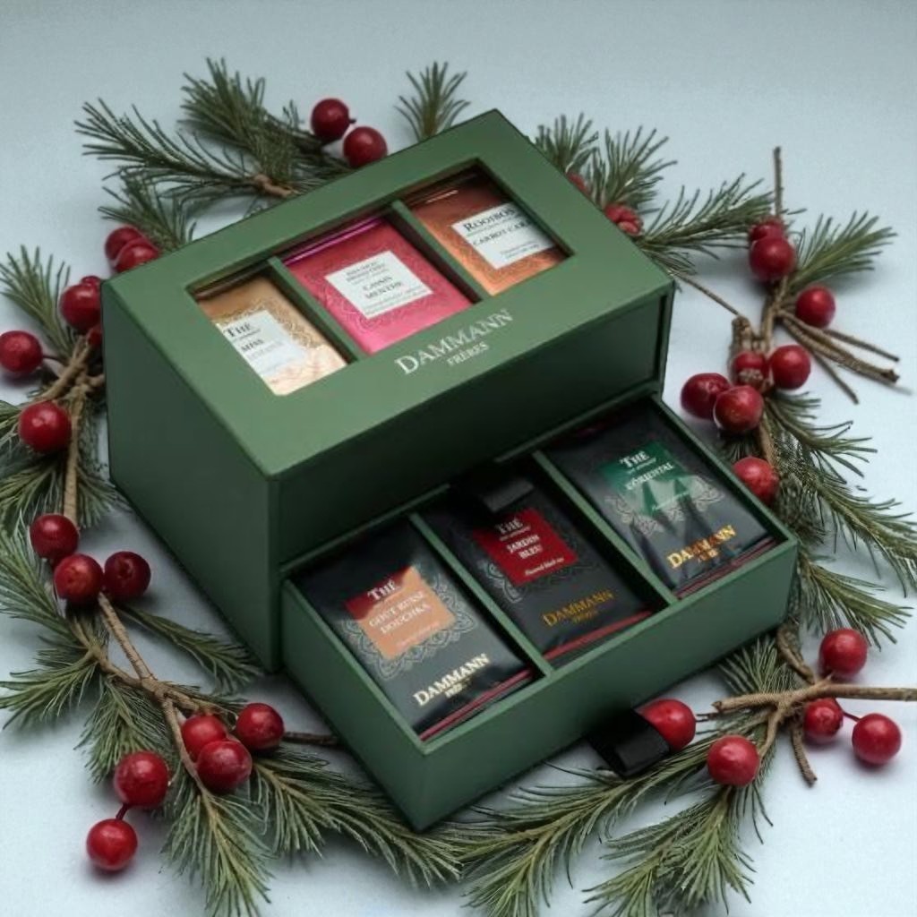 Le Coffret Parfums de Dammann Frères est une véritable invitation à la découverte. Élégant et généreux, il contient 42 sachets Cristal® enveloppés, répartis en 6 créations emblématiques de la maison. Cet assortiment harmonieux permet de savourer la richesse des thés noirs et verts, mais aussi la douceur des infusions sans théine.