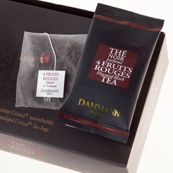 Le thé Quatre Fruits Rouges de Dammann Frères est un mélange de thé noir parfumé aux arômes naturels de fraise, cerise, groseille et framboise. Ce thé aux saveurs riches et gourmandes offre une liqueur ambrée et douce, parfaite pour une pause sucrée à tout moment de la journée. Présenté en boîte de 24 sachets Cristal suremballés, il garantit une infusion pratique, rapide et une conservation optimale des arômes. Ce thé est idéal pour les amateurs de thés noirs parfumés, aux notes intenses et fruitées.