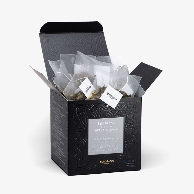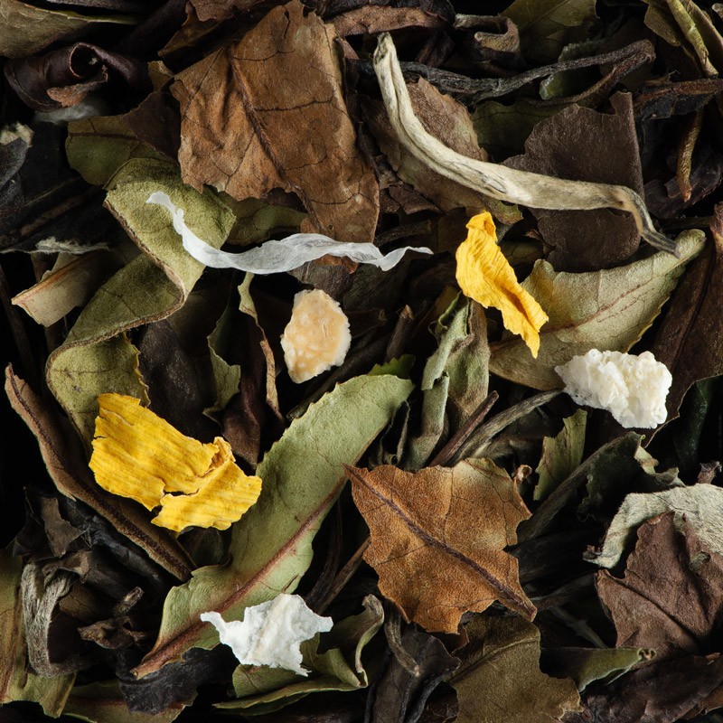 Un thé blanc Paï Mu Tan aux notes naturelles rafraîchissantes et fruitées, mêlé aux parfums de bergamote, de mangue et d’amande offre à l’infusion une tasse ronde, à la texture moelleuse et à la saveur douce et gourmande.