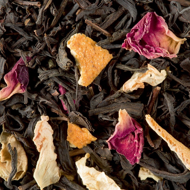 Riche accord fleuri et fruité pour ce mélange de thés noirs parfumé aux arômes abricot, figue, pitanga, citron, bergamote et fleur de lotus, enrichi d’écorces d’orange et de pétales de fleur.