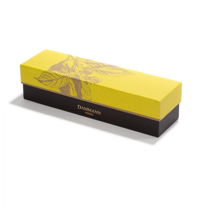 Coffret jaune, assortiment de 4 thés parfumés et un infuseur à thé.