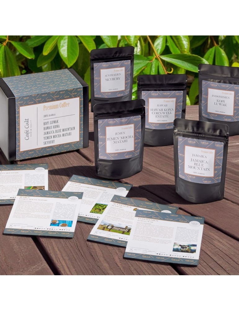 Chaque sachet de 50 g vous emmène vers un terroir d’exception : le Jamaïque Blue Mountain, café mythique à la rondeur parfaite ; le Kona d’Hawaï, doux et fruité ; le Moka Matari du Yémen, aux notes épicées et intenses ; l’Australie Skybury, équilibré et soyeux ; et enfin le très rare Kopi Luwak d’Indonésie, l’un des cafés les plus précieux au monde.