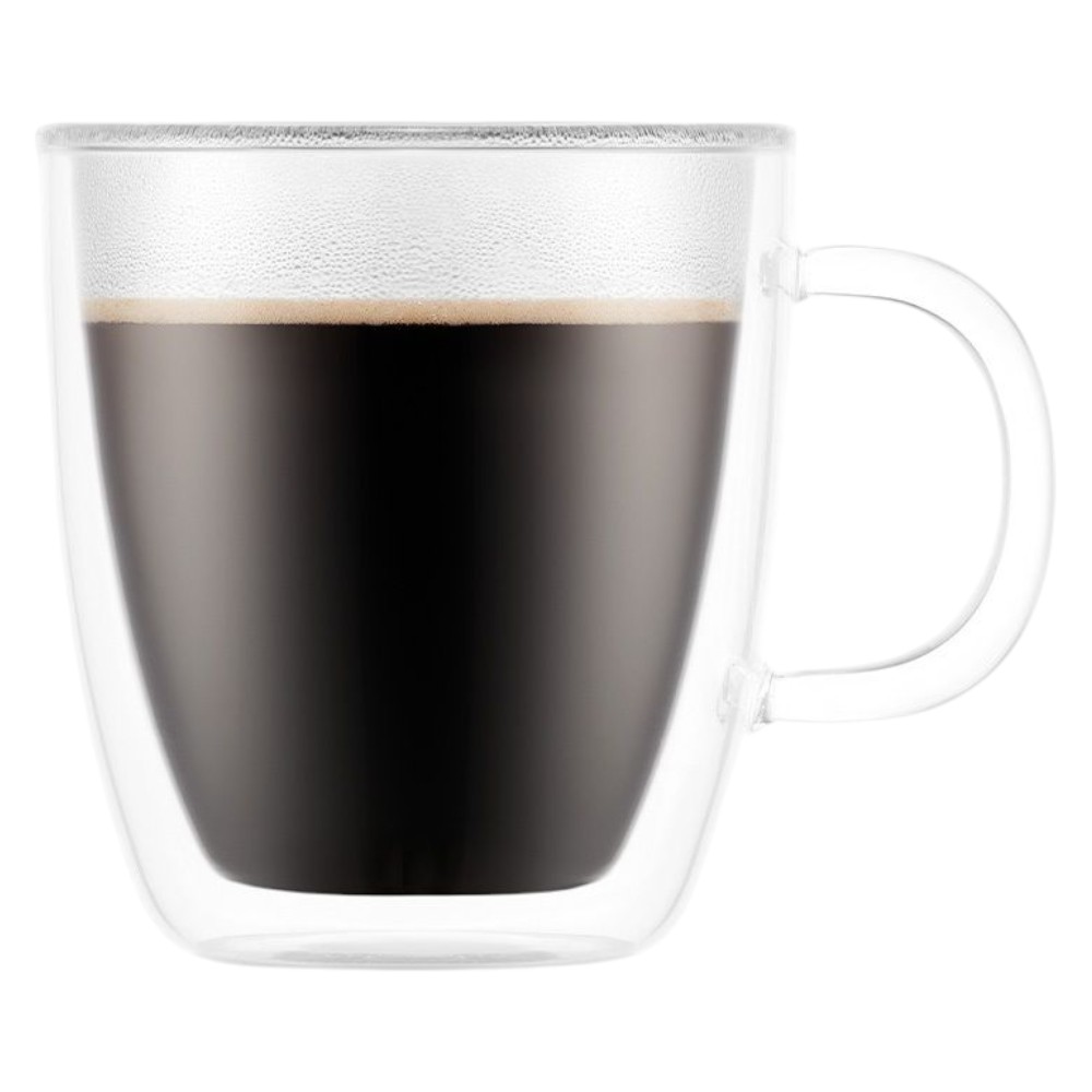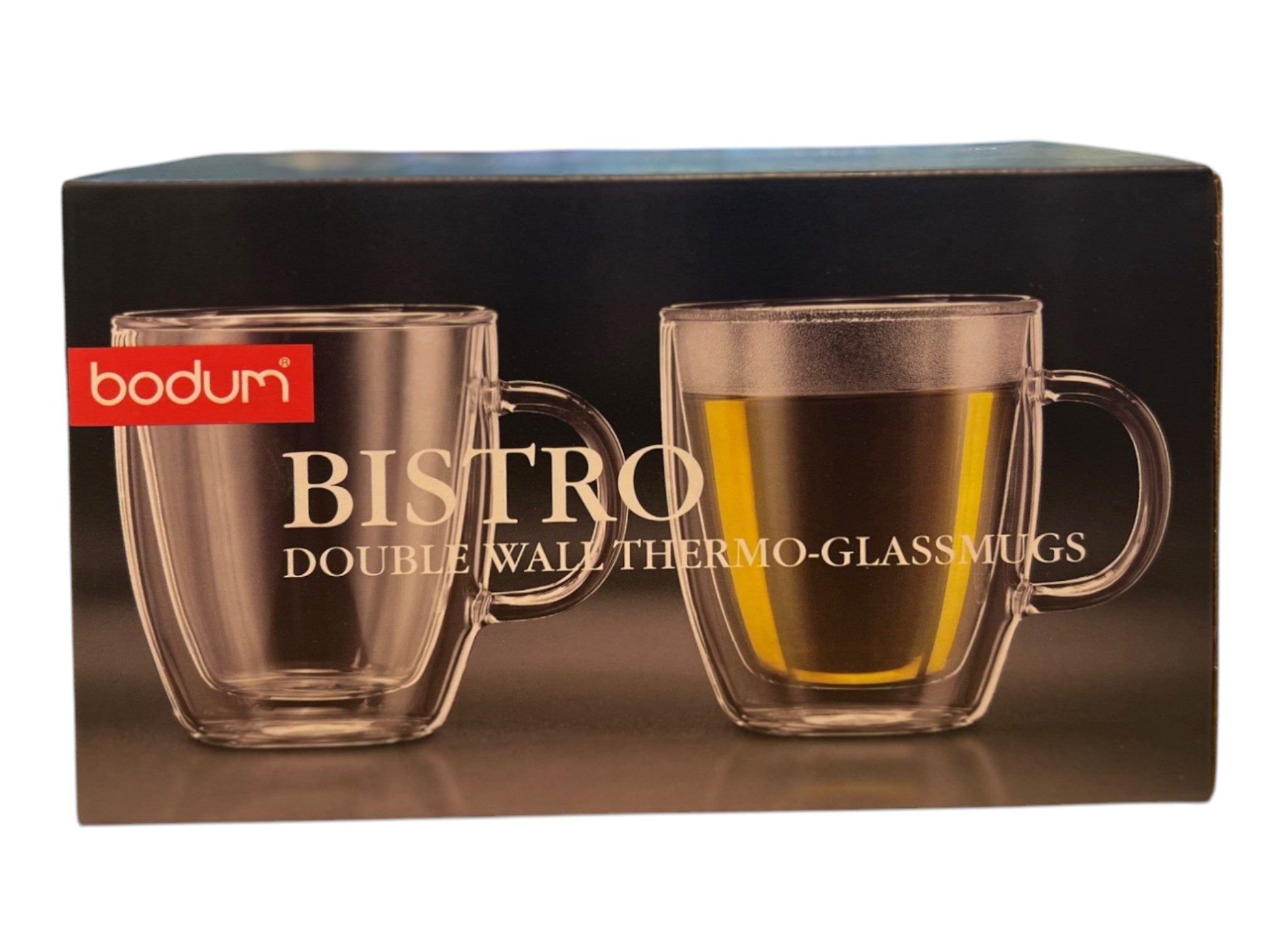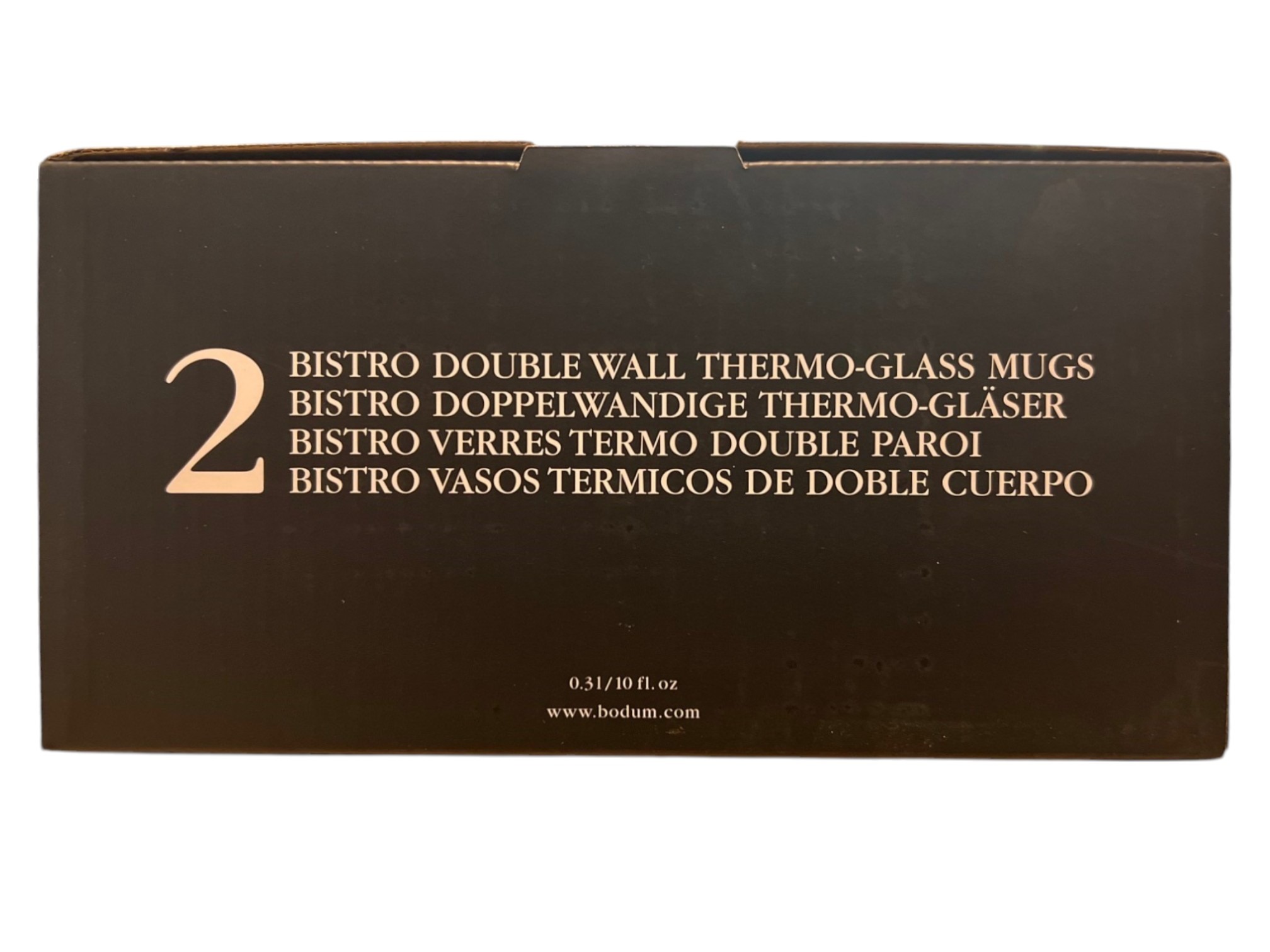 Set de 2 mugs en verre double paroi de la gamme Bistro de Bodum, d’une capacité de 30 cl (300 ml) chacun, conçus pour déguster espresso, café allongé, thé ou infusions tout en conservant la chaleur plus longtemps. La construction en verre borosilicate résistant à la chaleur assure une isolation thermique efficace : vos boissons chaudes restent chaudes plus longtemps sans brûler les doigts grâce à l’effet de double paroi, et les boissons froides restent fraîches sans condensation externe. Le design transparent met en valeur le contenu, tandis que l’ergonomie de l’anse garantit une prise en main confortable. Léger et élégant, cet ensemble s’intègre à différents styles de vaisselle et constitue une excellente option pour un usage quotidien ou à offrir en cadeau aux amateurs de café et de boissons chaudes.