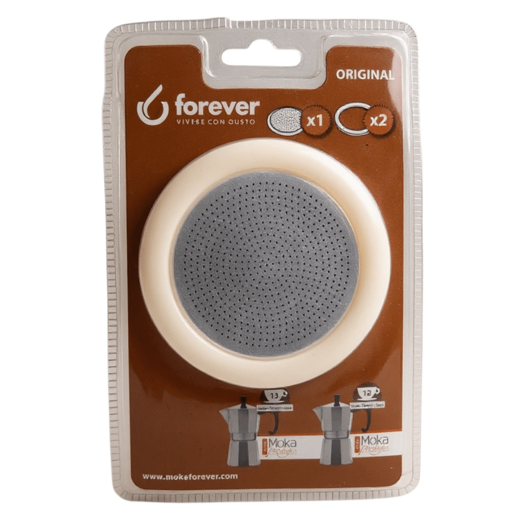Joint de rechange Forever spécialement conçu pour les cafetières italiennes en aluminium 12 et 18 tasses, garantissant une étanchéité fiable et une extraction homogène. Conformément aux standards de la marque, il assure une pression constante indispensable à une montée régulière du café et à la préservation des arômes. Ce joint est vendu par lot de 2 avec 1 filtre inox, solution idéale pour l’entretien durable de votre cafetière de grande capacité.