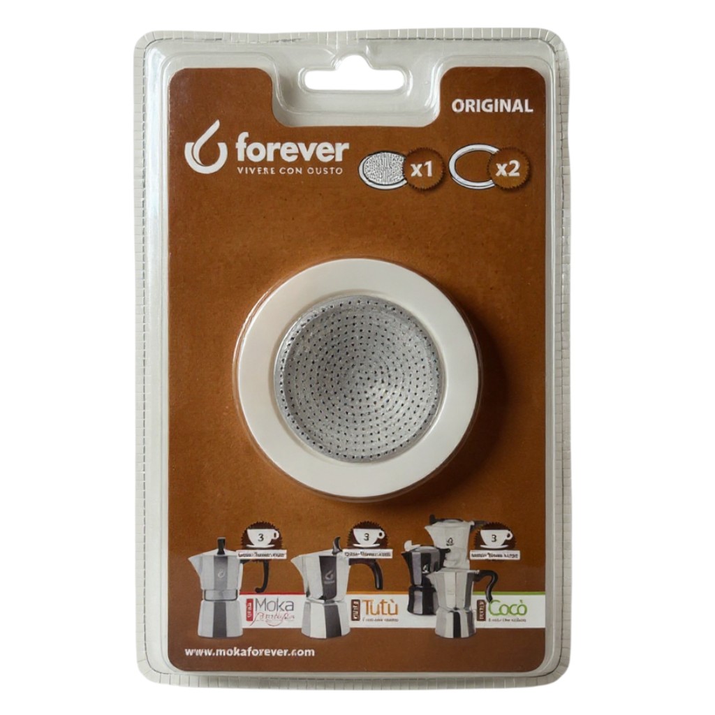 Joint de rechange Forever conçu pour les cafetières italiennes en aluminium 3 tasses, garantissant une étanchéité fiable et une extraction régulière du café. Conforme aux standards de la marque, il permet de maintenir une pression constante, essentielle pour révéler les arômes et assurer une montée homogène. Ce joint est vendu par lot de 2 avec 1 filtre inox, solution pratique pour un entretien durable et précis de votre cafetière.