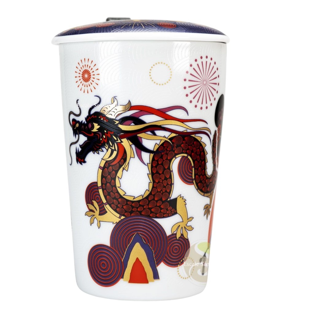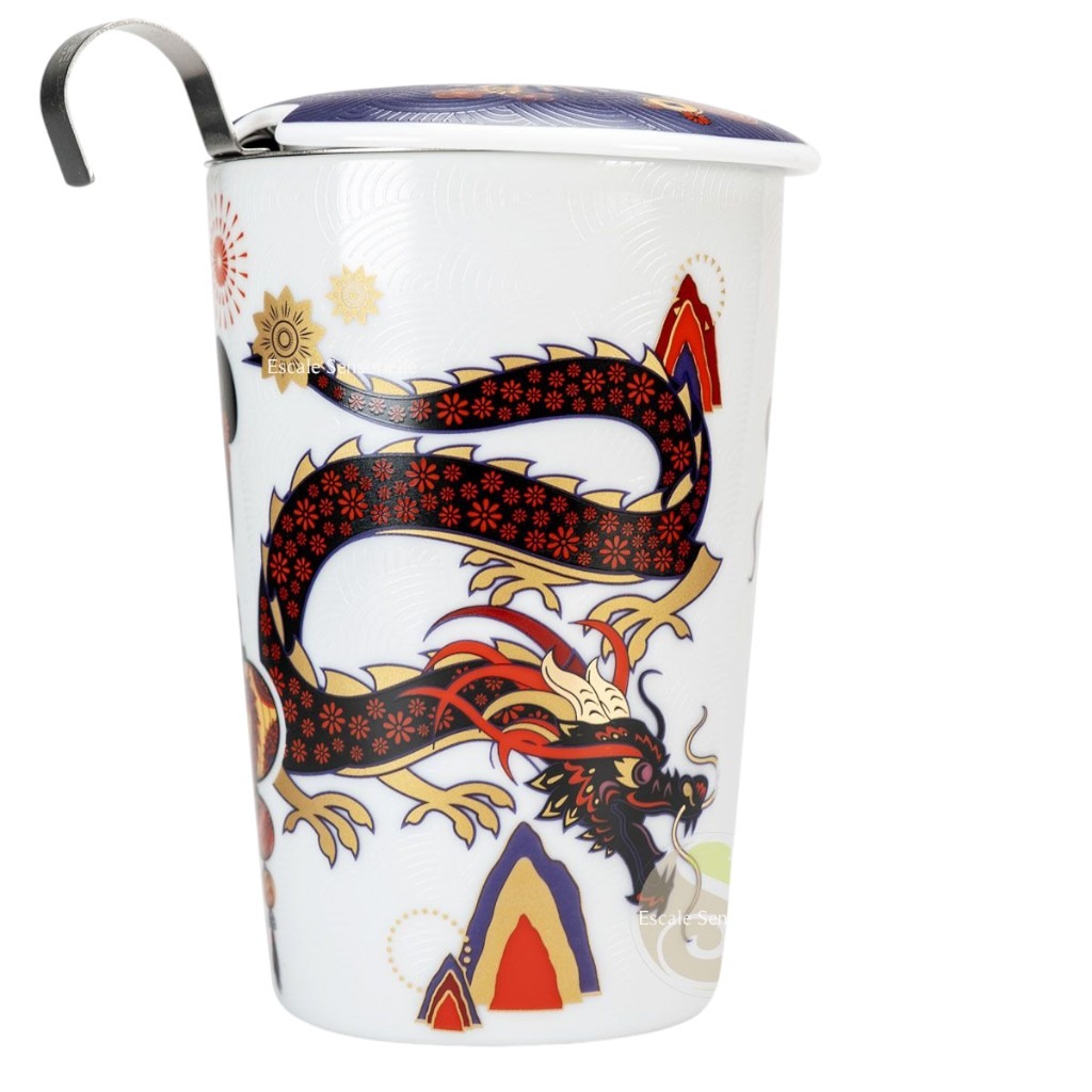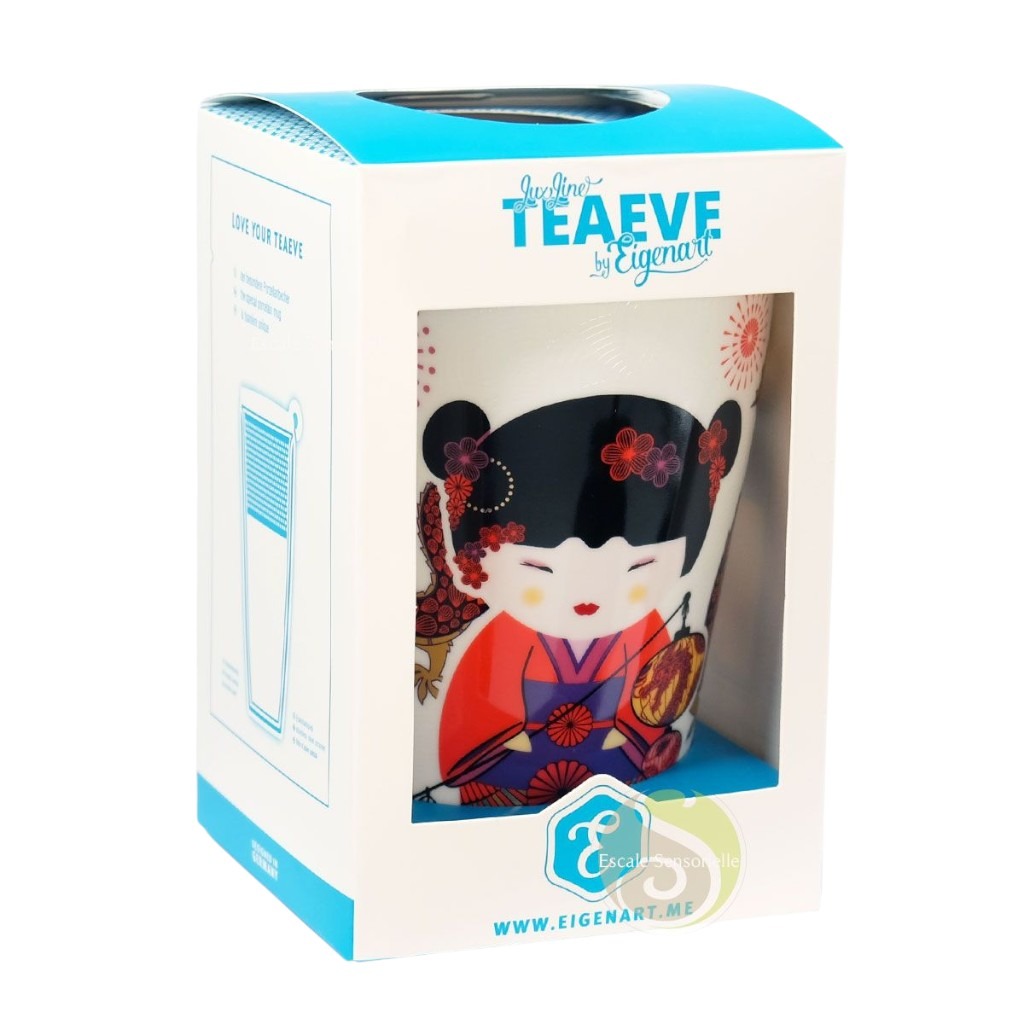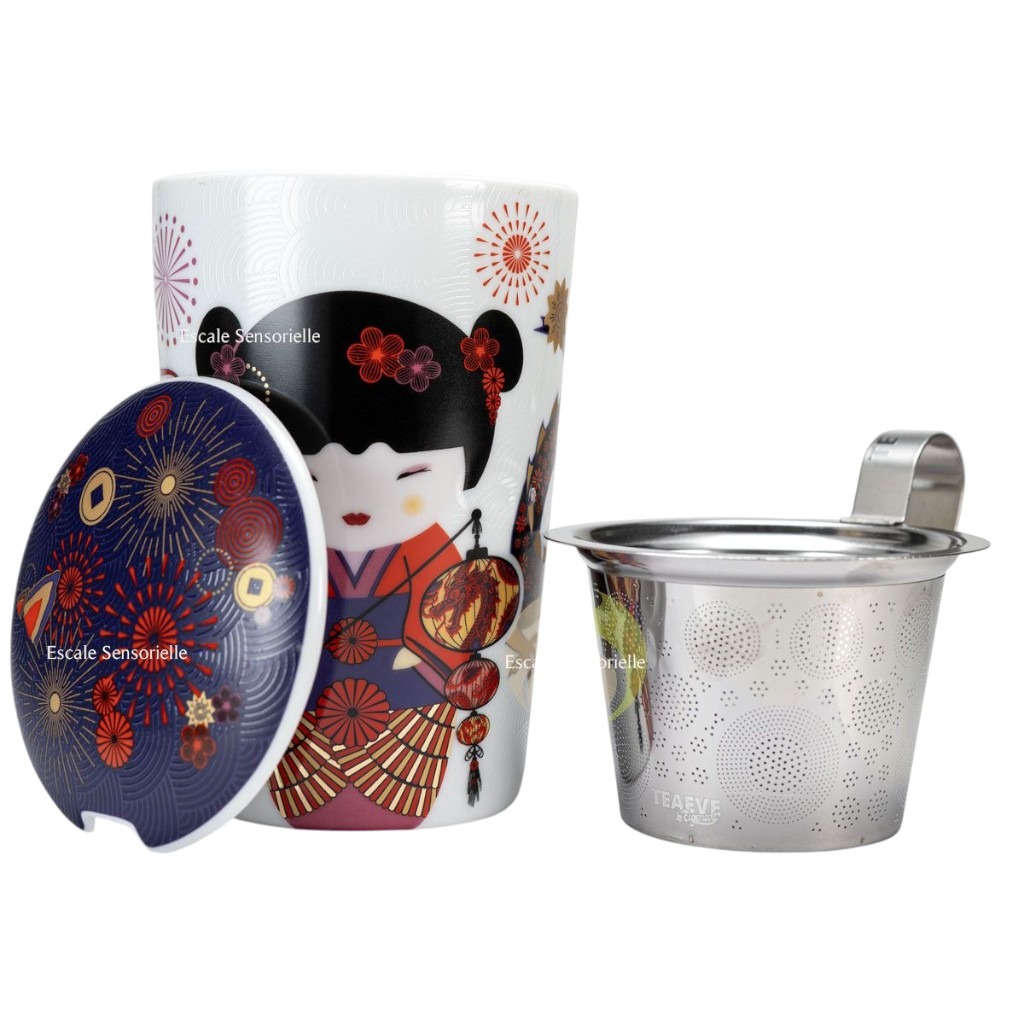 Tisanière Teaeve Sweet Little Geisha Fire, mug en porcelaine double paroi décoré aux motifs inspirés de la geisha, conçu pour une infusion optimale de thé, tisane ou infusion. Cette tasse élégante associe design artistique et fonctionnalité pratique : la double paroi en porcelaine conserve la chaleur du liquide tout en permettant une prise en main confortable sans se brûler. Elle est équipée d’un grand filtre en acier inoxydable à perforations fines qui favorise le développement des arômes du thé en vrac, tout en restant facile à retirer grâce à une poignée intégrée. Le couvercle assorti en porcelaine sert à la fois à isoler thermiquement votre infusion et à poser proprement le filtre après usage. Avec une capacité d’environ 350 ml, cette tisanière est adaptée aux dégustations quotidiennes à la maison ou au bureau. Le set est livré dans une boîte cadeau exclusive, ce qui en fait un accessoire de choix pour les amateurs de thé ou une idée cadeau esthétique et fonctionnelle.
