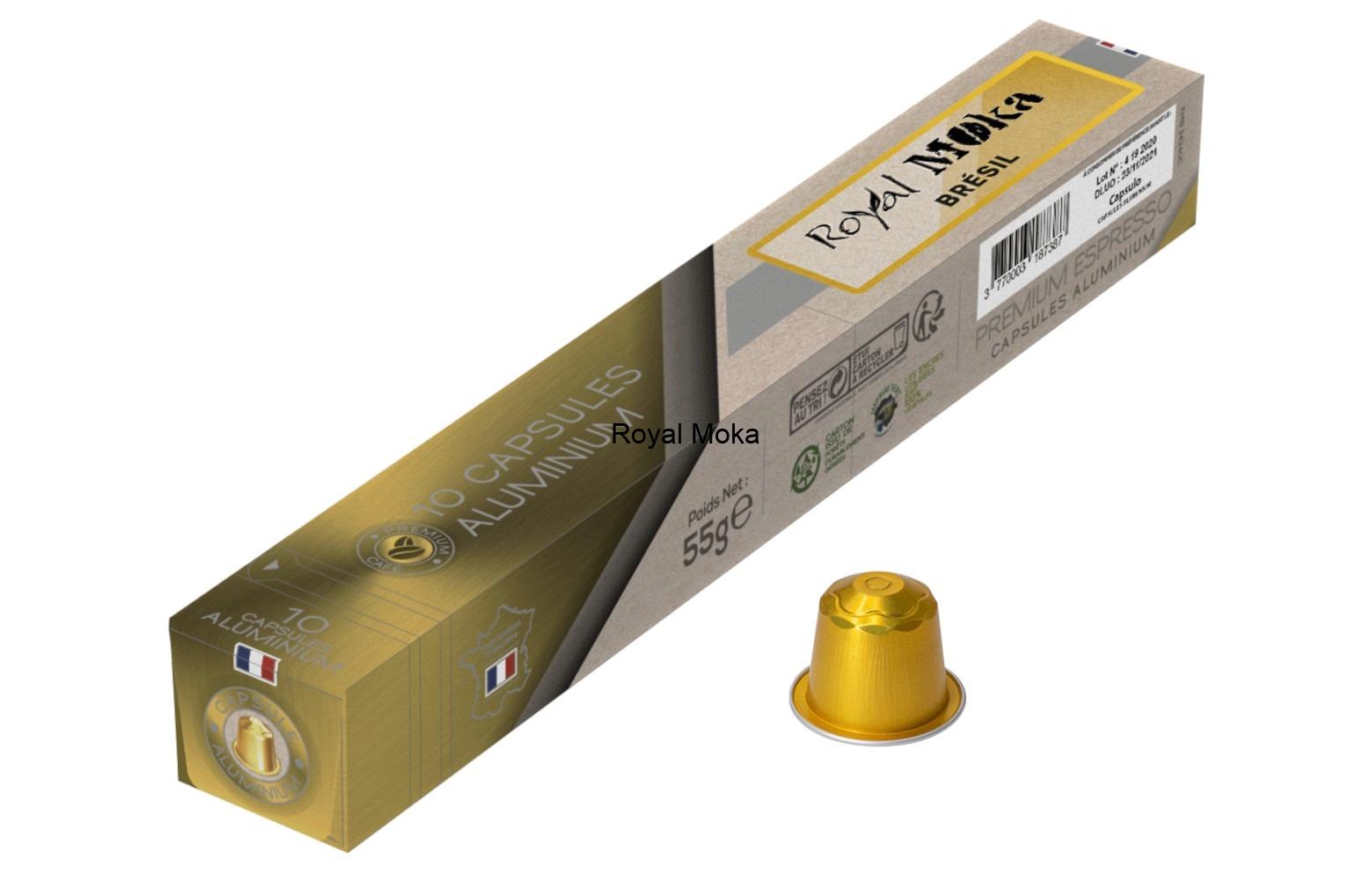 Nos capsules compatibles Nespresso® Royal Moka sont remplies avec notre propre café, torréfié sur place dans notre boutique à partir de grains rigoureusement sélectionnés. Ce Brésil Sul de Minas, 100 % Arabica, est un café doux et équilibré, apprécié pour sa faible acidité et sa grande rondeur en tasse. Le dosage précis de 5,5 g par capsule garantit une extraction régulière et une tasse harmonieuse sur toutes les machines Nespresso®. À la dégustation, on retrouve des notes délicates de fruits à coque et de cacao, avec une belle souplesse et très peu d’amertume. Un café idéal pour un expresso quotidien, accessible et élégant.