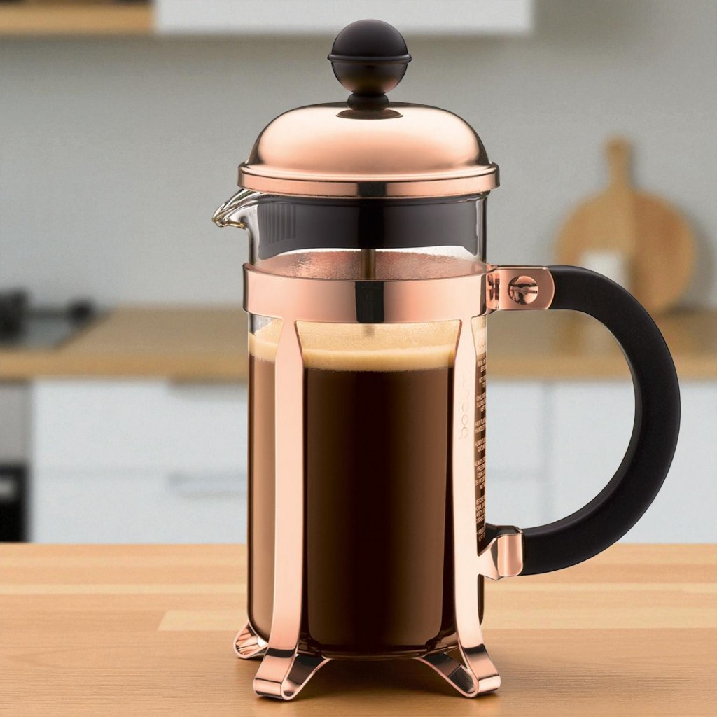 La cafetière à piston Bodum Chambord Cuivre 1 L reprend le design classique du modèle Chambord tout en offrant une finition cuivrée raffinée. Sa carafe en verre borosilicate, résistante aux variations de température, garantit une infusion homogène et précise. L’armature en acier inoxydable plaqué cuivre protège efficacement le verre tout en apportant une touche décorative élégante à votre cuisine. Le piston en acier inox assure une filtration uniforme pour séparer correctement les grains de café et obtenir une boisson claire et riche en saveurs.