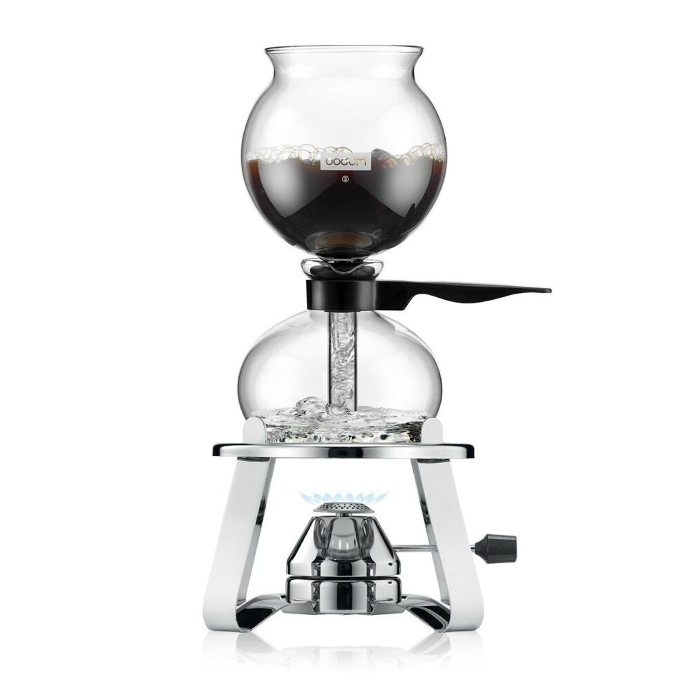 Cafetière à dépression PEBO 1 L de Bodum, conçue pour une extraction aromatique et spectaculaire du café grâce à la méthode de brassage par vide/pression. Ce système ancien et fascinant chauffe l’eau dans la chambre inférieure puis, sous l’effet de la pression, la fait monter dans la chambre supérieure où elle se mélange au café grossièrement moulu, capturant ainsi une vaste palette d’arômes avant de redescendre une fois l’infusion terminée : un procédé qui met en valeur la richesse et l’équilibre des profils aromatiques. La cafetière est fabriquée en verre borosilicate résistant à la chaleur, qui permet d’observer tout le processus d’infusion, et elle est livrée avec un support en acier inoxydable facile à démonter et un brûleur à gaz portable pour chauffer sans électricité. L’ensemble est particulièrement adapté à l’usage en extérieur, au camping ou lors de moments où une préparation manuelle et théâtrale est souhaitée .