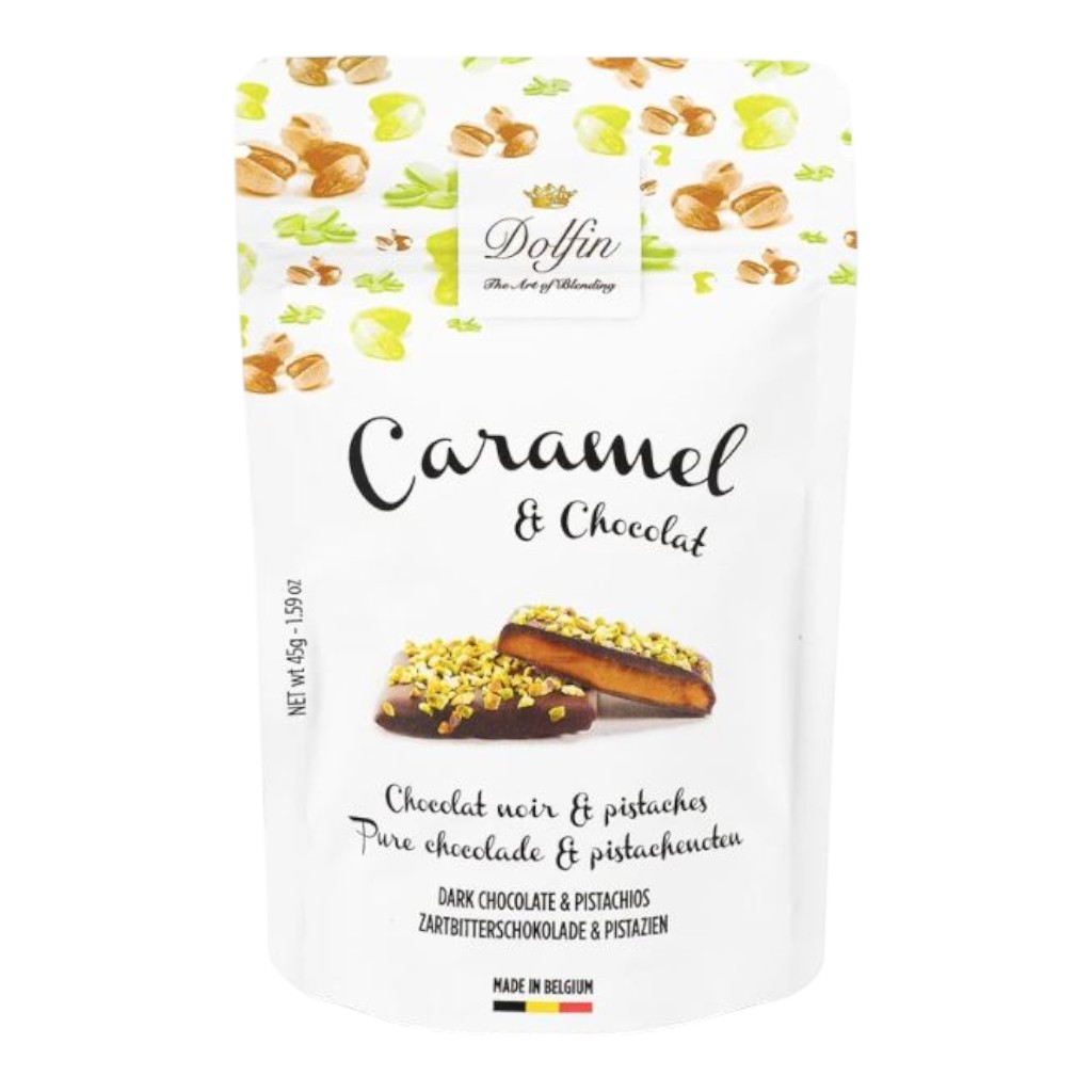 Le pochon caramel & chocolat noir – pistaches grillées est une création gourmande de Dolfin, fidèle à l’élégance et au savoir-faire du chocolat belge. Des caramels au beurre salé fondants sont enrobés de chocolat noir intense, puis délicatement parsemés d’éclats de pistaches grillées pour une touche croquante et raffinée.