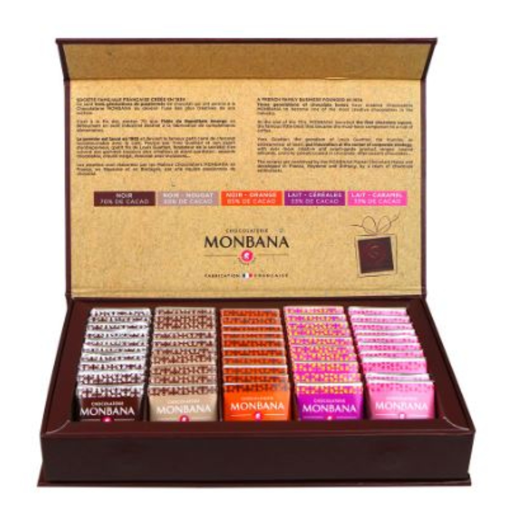 Fabriqué en France, ce coffret reflète le savoir-faire chocolatier Monbana et la qualité de ses recettes.