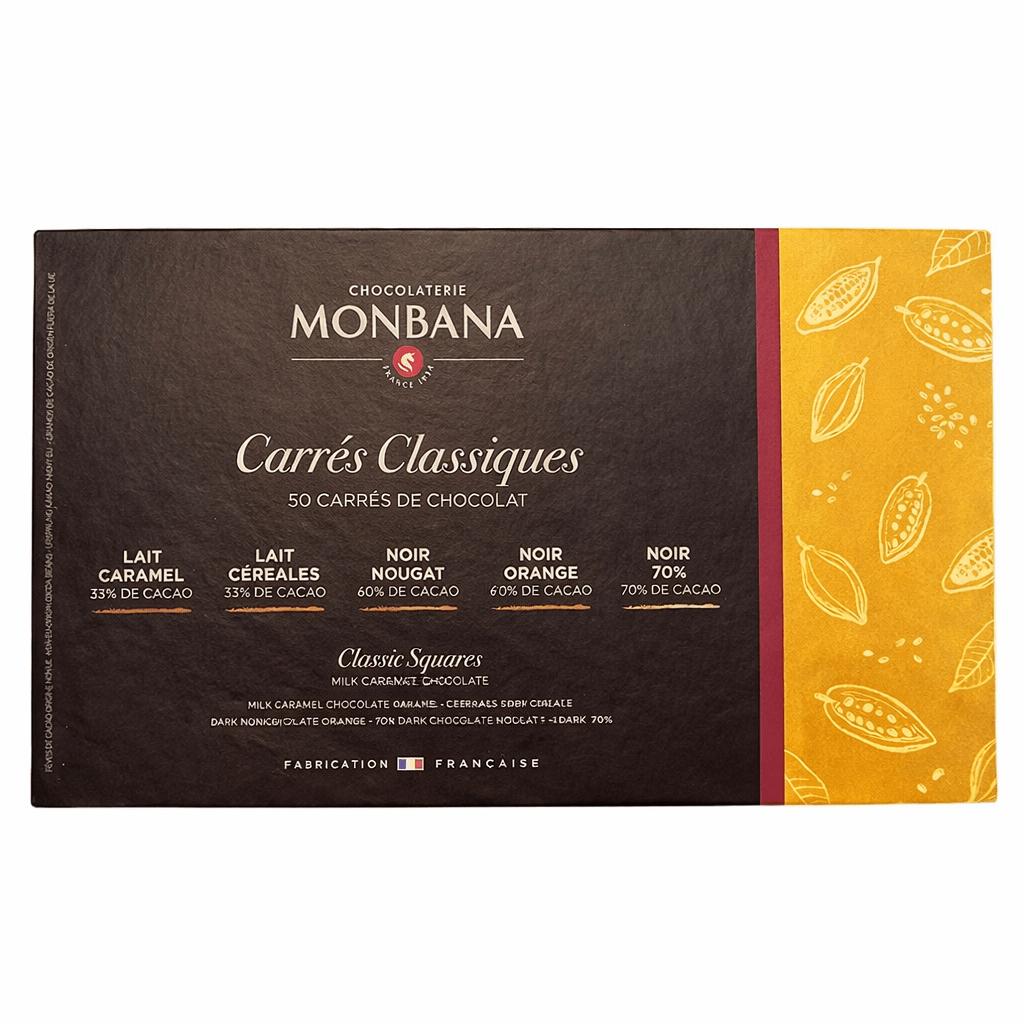 Le Coffret 50 Carrés de Chocolat Monbana est une sélection gourmande et variée, idéale pour découvrir différentes expressions du chocolat. Conçu pour le partage ou la dégustation individuelle, ce coffret réunit des recettes emblématiques mêlant intensité, douceur et gourmandise.
