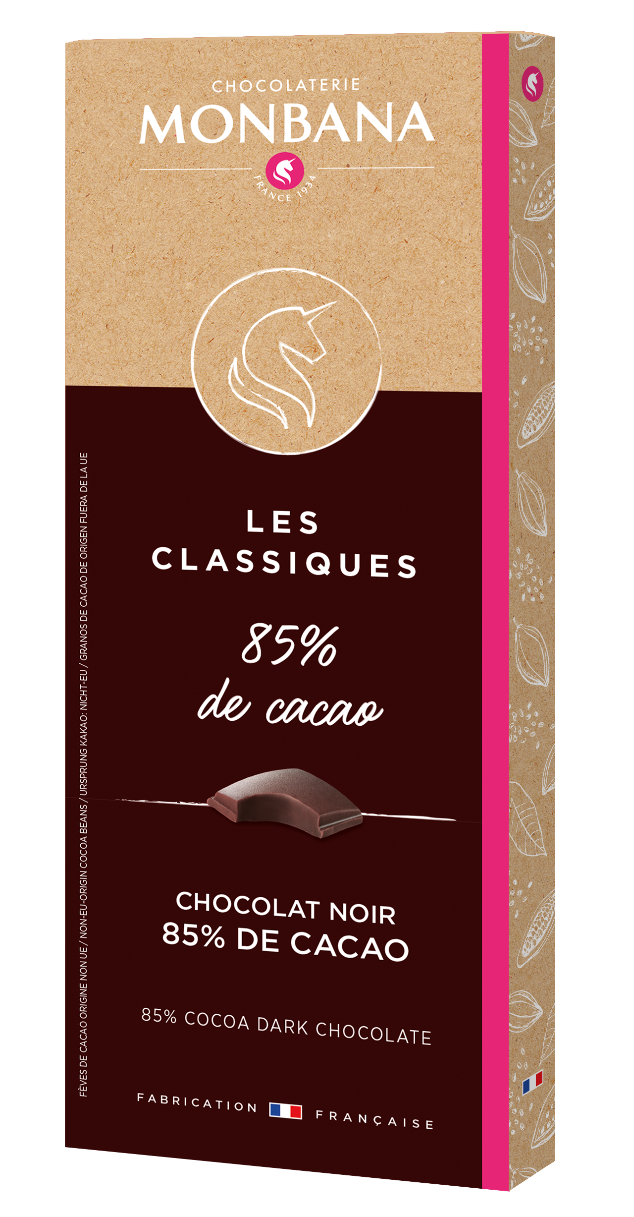 Un chocolat noir 85% de cacao intense pour les amateurs de saveurs amères.