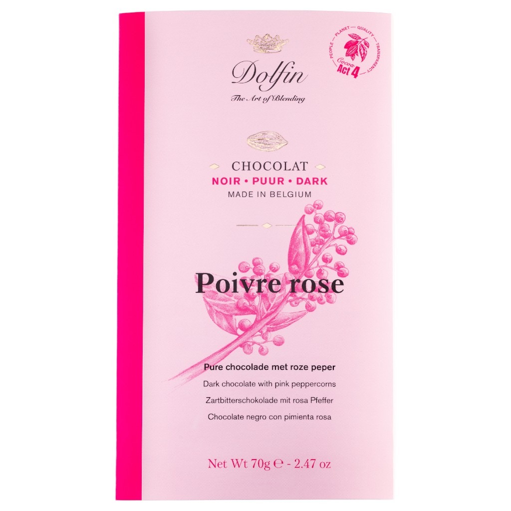 Formulée à 60 % de cacao minimum, cette tablette offre une dégustation équilibrée, où la puissance du chocolat noir se marie harmonieusement avec des notes épicées douces et légèrement florales. Le poivre rose vient relever le profil cacaoté sans le dominer, pour une expérience sensorielle élégante et persistante.