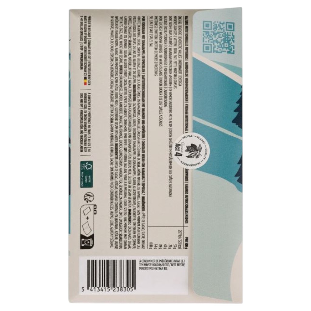 Pâte de cacao, sucre, orange confite (3 %) (orange, sucre, sirop de glucose), beurre de cacao, épices (2 %) (gingembre, cannelle), émulsifiant : lécithine de SOJA, arôme naturel de vanille.