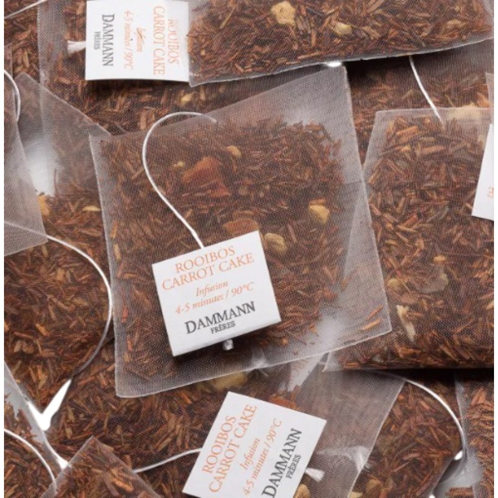 Le Rooibos Carrot Cake Dammann Frères est une infusion gourmande sans théine inspirée du célèbre gâteau américain. Il associe la douceur naturellement miellée du rooibos à un mélange d’épices et de notes pâtissières pour une tasse ronde et veloutée. Dès l’infusion, les arômes de cannelle et de gingembre s’expriment, accompagnés de touches d’amande, de noix de pécan, de biscuit et de carotte, créant une sensation chaleureuse et réconfortante. L’ensemble évoque fidèlement le goût du carrot cake, avec un équilibre entre douceur, épices et notes légèrement boisées. Cette infusion offre une texture gourmande en bouche, idéale pour les amateurs de boissons sucrées et parfumées, sans amertume et sans caféine. Grâce aux sachets Cristal®, l’infusion est optimale et permet une excellente diffusion des arômes, proche d’un rooibos en vrac de qualité.