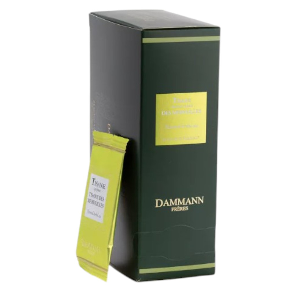 Tisane des Merveilles Dammann Frères, infusion sans théine aux notes fruitées et florales, associe verveine et tilleul à des arômes délicats pour une dégustation douce et équilibrée. Dès les premières gorgées, cette tisane révèle un bouquet aromatique subtil mêlant rhubarbe, framboise, fraise, datte, fleur d’oranger et rose. L’infusion développe une liqueur claire, élégante et naturellement parfumée, idéale pour un moment de détente à tout moment de la journée. Les saveurs sont harmonieuses, ni trop sucrées ni trop marquées, offrant une sensation apaisante et réconfortante. Les sachets Cristal® permettent une infusion optimale des ingrédients et une parfaite diffusion des arômes dans l’eau chaude. Chaque sachet est suremballé individuellement afin de préserver la fraîcheur et l’intensité du mélange. Une tisane raffinée, sans caféine, adaptée aussi bien aux pauses bien-être qu’aux instants de relaxation en soirée.