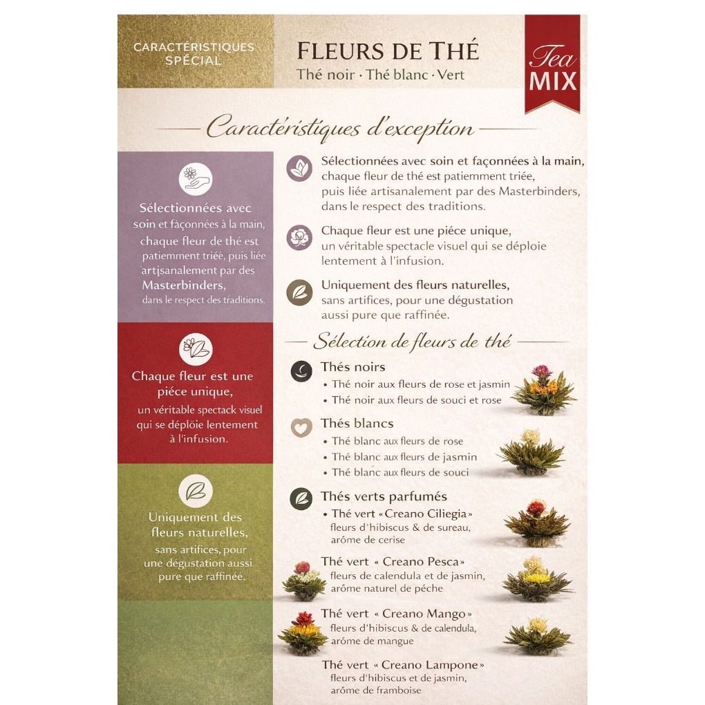 Découvrez le coffret cadeau Fleurs de Thé Creano, une sélection raffinée de 12 fleurs de thé offrant une expérience à la fois visuelle et gustative unique. Chaque fleur de thé est composée de feuilles de thé soigneusement cousues à la main autour de véritables fleurs séchées. Lors de l’infusion, la boule s’ouvre lentement pour révéler une fleur délicate, transformant la dégustation en un véritable spectacle. Ce coffret propose un assortiment équilibré de thés noirs, thés blancs et thés verts, associés à des fleurs naturelles telles que le jasmin, la rose ou le souci, parfois complétées par des notes fruitées subtiles. Au-delà de l’esthétique, l’infusion est douce, aromatique et élégante. Présenté dans un coffret soigné, ce set constitue un cadeau idéal pour les amateurs de thé, les moments de détente ou les occasions spéciales, alliant tradition, artisanat et plaisir des sens.