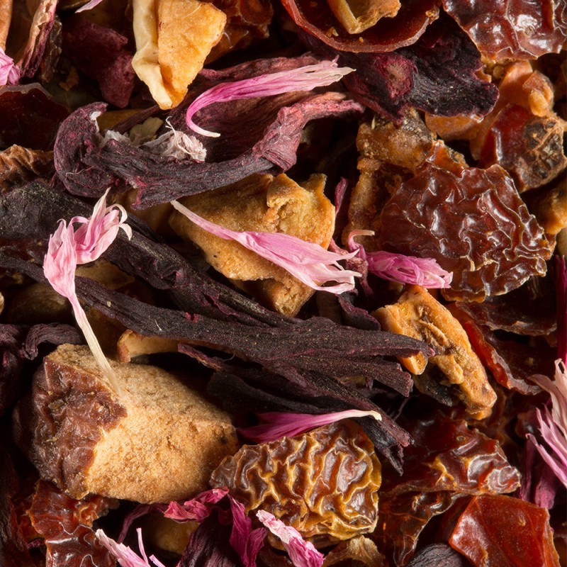 Au cœur de ce mélange se trouvent les saveurs douces et fruitées de la cerise et de l’amande, qui rappellent les gourmandises traditionnelles de Noël. Ces notes sucrées sont équilibrées par l’acidité naturelle de la fleur d’hibiscus et du cynorrhodon, qui apportent fraîcheur et légèreté à l’infusion. Enfin, des touches chaleureuses de pain d’épices et de gingembre viennent sublimer le mélange, ajoutant une profondeur épicée et réconfortante.